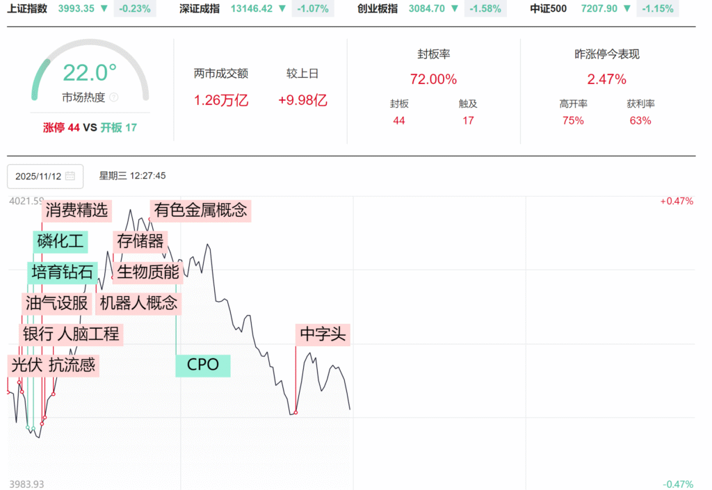 市场早盘震荡走弱,三大指数翻红后再度回落,创业板指跌超1%。沪深两市半日成交额1.26万亿,较上个交易日放量9亿。盘面上热点较为杂乱,全市场超4000只个股下跌。从板块来看,银行板块逆势上涨,农业银行、工商银行双双再创历史新高。机器人概念股局部活跃,首开股份直线涨停。油气板块走强,石化油服、准油股份双双涨停。食品饮料概念股表现较强,三元股份、中锐股份3连板,中粮糖业2连板。下跌方面,超硬材料概念股集体走弱,沃尔德跌超12%。光伏概念股重挫,通威股份、隆基绿能大跌。板块方面,油气、保险、医药商业等板块涨幅居前,培育钻石、光伏设备、可控核聚变、磷化工等板块跌幅居前。截至收盘,沪指跌0.24%,深成指跌1.07%,创业板指跌1.58%。