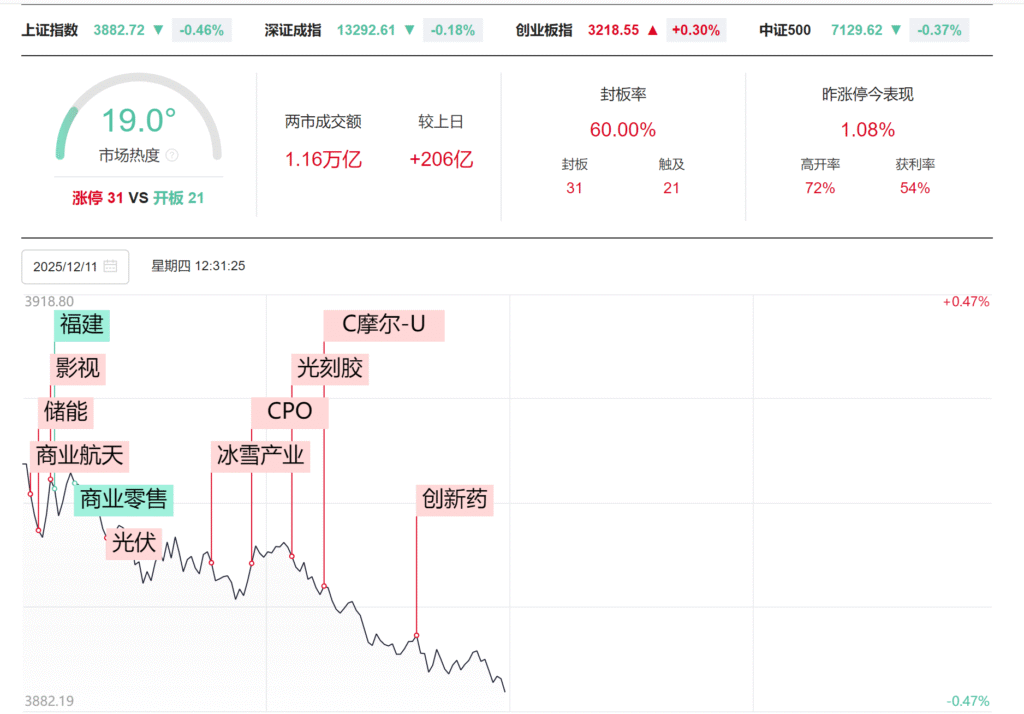 早盘三大指数涨跌不一,沪指震荡下跌,创业板指冲高回落,此前一度涨超1%。黄白线分化,微盘股指数跌超1.5%。沪深两市半日成交额1.16万亿,较上个交易日放量206亿。全市场超4200只个股下跌。从板块来看,商业航天概念延续强势,再升科技4连板,四川金顶6天3板,华菱线缆、金风科技、银河电子等多股涨停。算力硬件概念表现活跃,富信科技触及20cm涨停,赛微电子、新易盛盘中双双创历史新高。下跌方面,零售集体下挫,茂业商业触及跌停。福建方向多股走弱,海欣食品、舒华体育跌停。板块方面,电网设备、商业航天等板块涨幅居前,零售、房地产等板块跌幅居前。截至收盘,沪指跌0.46%,深成指跌0.18%,创业板指涨0.3%。