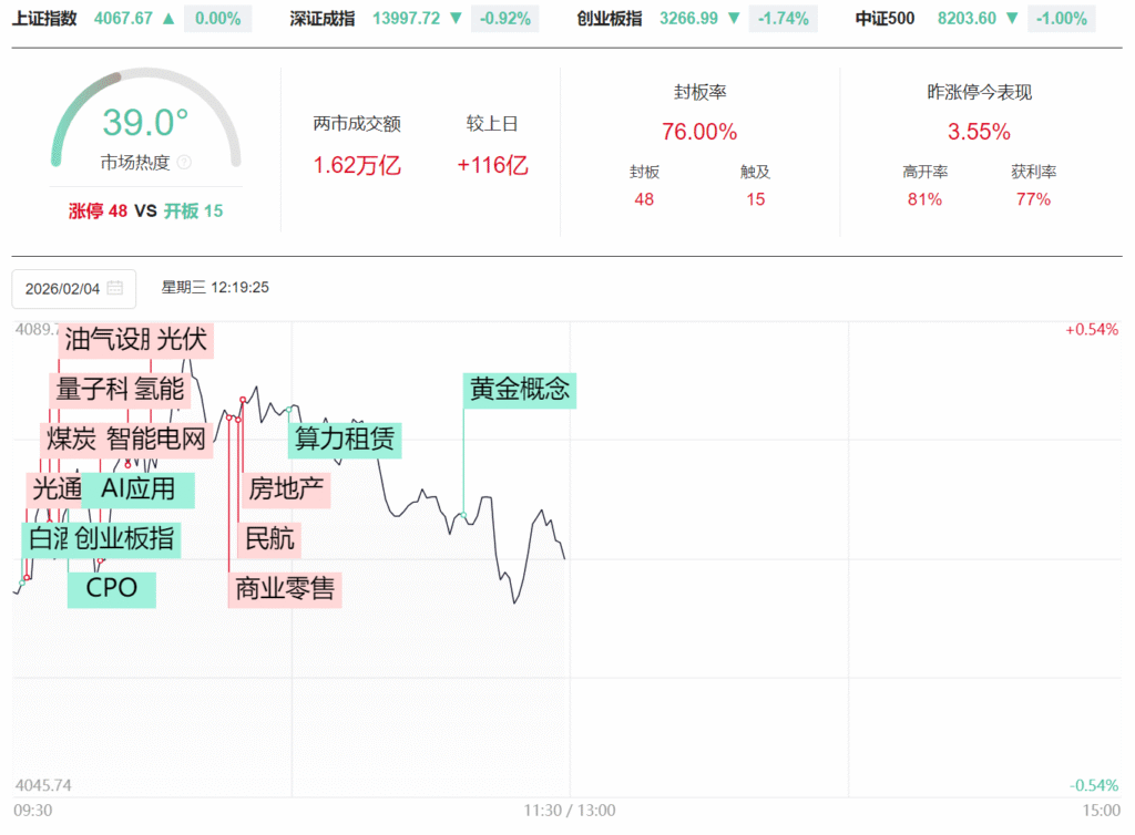 市场早盘震荡回落,沪指翻绿,创业板指盘中跌超2%。沪深两市半日成交额1.62万亿,较上个交易日放量116亿。盘面上热点快速轮动,全市场超2900只个股下跌。从板块来看,太空光伏概念爆发,中来股份20cm涨停,国晟科技2连板。煤炭概念集体反弹,兖矿能源、中煤能源、陕西黑猫涨停。机场航运概念走强,中国东航、华夏航空涨停。房地产板块表现活跃,荣安地产、财信发展涨停。氢能源概念快速拉升,京城股份、致远新能涨停。下跌方面,贵金属概念高开低走,招金黄金、四川黄金大跌。AI应用概念集体下挫,引力传媒跌停。截至收盘,深成指跌0.92%,创业板指跌1.74%。